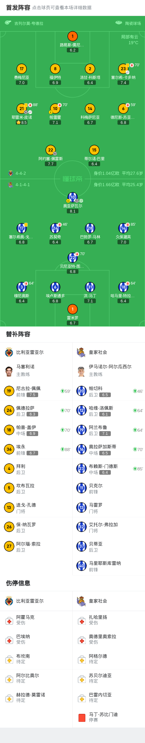 北京时间4月20日,西班牙足球甲级联赛第32轮,比利亚雷亚尔主场迎战皇家社会。比赛中,耶雷米-皮诺为比利亚雷亚尔首开纪录,随后奥亚萨瓦尔通过点球为皇家社会扳平比分。此后,奥亚萨瓦尔再入一球完成梅开二度,但阿约塞-佩雷斯在关键时刻为比利亚雷亚尔将比分追平。最终,双方以2-2的比分结束本场比赛。