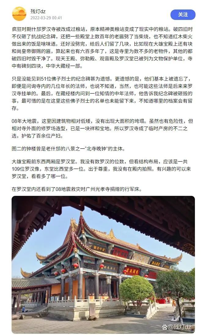 为了纪念为抗战牺牲的51位僧人,什邡罗汉寺以前还建了一座抗战纪念碑,碑上有51位僧人的名字。可惜纪念碑毁于破四旧的那个年代,以至于现在51位僧人的名字也没有留下来。