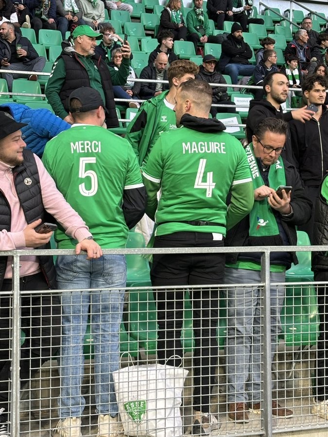 为了不错过激怒里昂球迷的机会,两名圣埃蒂安球迷决定创造一个独特的信息来感谢马奎尔的进球,并嘲讽里昂。两位支持者都穿着圣埃蒂安的球衣,其中一位的球衣上印着“Merci(谢谢),5”,另一位则写着“Maguire(马奎尔),4。”