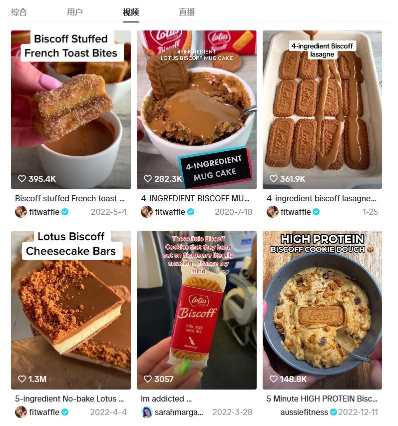 2020年开始,大量消费者将Biscoff作为“配料”,用于自制烘焙食品。而TikTok助推了这一趋势。如今在TikTok上搜索关键词“Biscoff”,仍可以看到大量点赞量超10万次的视频。