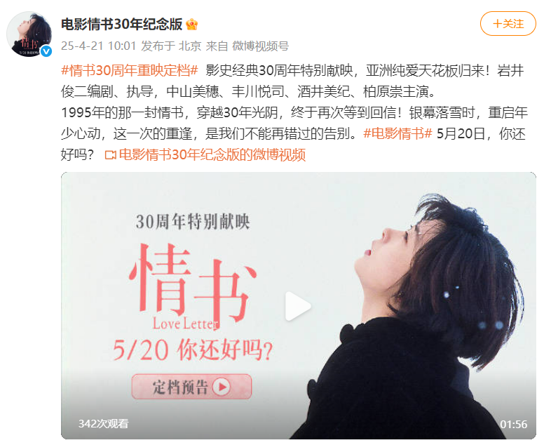 4月21日,据“电影情书30周年纪念版”官博消息:由岩井俊二导演,中山美穗、丰川悦司、酒井美纪、柏原崇主演的电影《情书》迎来公映30周年,中国内地重映定档5月20日。