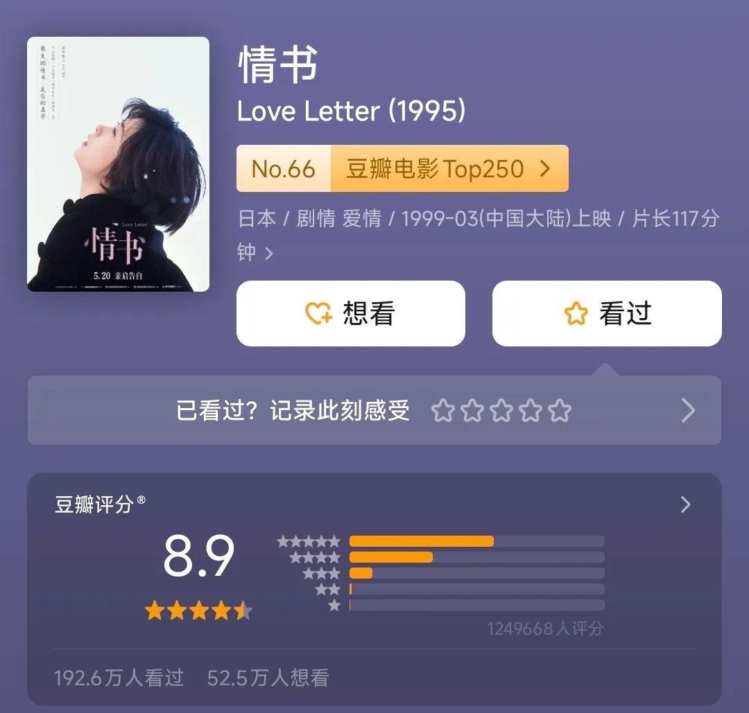 据悉,《情书》于1995年3月25日在日本首映,1999年引进中国内地发行,2021年5月20日在中国内地重映。该片获得蒙特利尔国际影展“观众票选最佳影片”奖(1995年)和第19届日本电影学院奖“最佳影片”提名(1996年)。