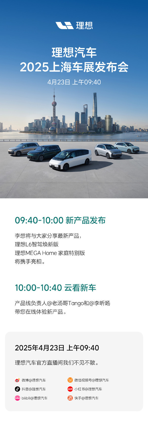 理想汽车官方表示,4月23日上午09:40,理想汽车将召开2025上海车展发布会,理想L6智驾焕新版和理想MEGA Home家庭特别版将正式发布。发布会之后,理想产品线负责人也将直播进行在线新品体验,欢迎大家在线收看。