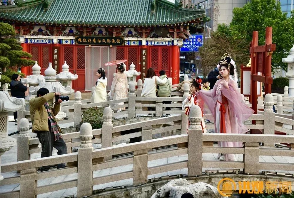随着滕王阁北园免费开放,景区人气持续攀升,游客络绎不绝,周边街区各类古装租赁、古装体验、古风摄影店铺如雨后春笋般涌现,绣罗霓裳点缀着古老街巷,为这座历史文化地标增添了一抹流动的风景线。
