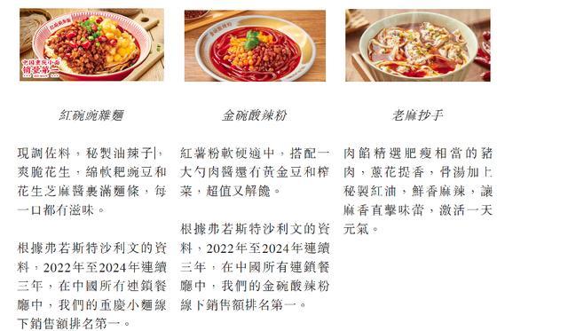 市场数据也反映了公司菜品的受欢迎程度。据“弗若斯特沙利文”数据显示,2022年-2024年,遇见小面的重庆小面、豌杂面和酸辣粉,这三款菜品的线下销量稳居连锁餐厅榜首。