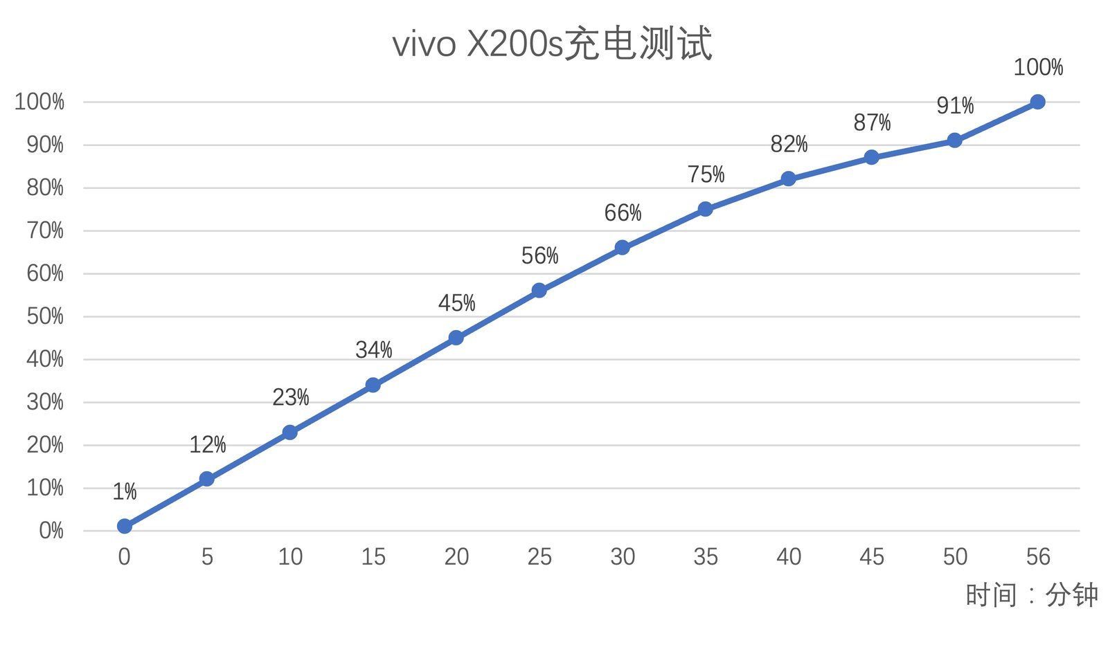 当然我们也实测了 90W 有线闪充的表现,在 vivo X200s 仅剩 1% 电量时开始充电,10 分钟就充入 23% 电量,半小时充入 66%,最后充至 100% 电量用时 56 分钟。表现还算中规中矩,但至少在低电量下可以快速回血,再结合 6200mAh 的电池,表现还是不错的。