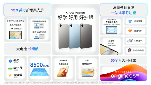 全新“超护眼辅导神器”vivo Pad SE搭载vivo首款12.3英寸纸感护眼柔光屏,致力成为用户学习、阅读、娱乐的好拍档。其内置专属学习中心,集合丰富功能模块,全面覆盖学龄前到高中阶段的多场景学习需求与教育资源,以及AI精准学等功能,轻松实现一站式智慧学习,更有专属点读镜,平板秒变学习机,孩子自学更高效,家长辅导更省心。vivo Pad SE目前已在vivo官网及各大电商平台开启预售,并将于4月25日正式开售,价格999元起。首销期间在各大电商平台购机可享国补优惠,低至849.15元起。