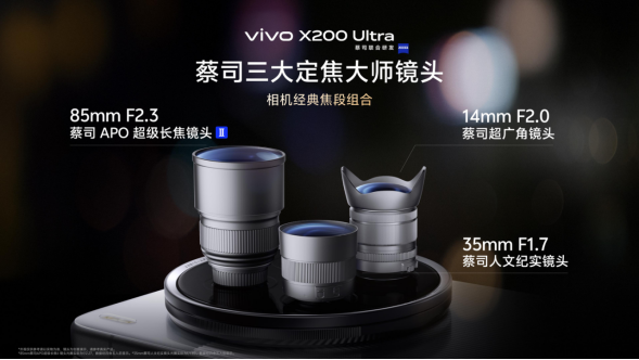 为了打造一款真正的专业创作者出行必备神器,vivo在X200 Ultra上推出了蔡司三大定焦大师镜头——14mm蔡司超广角镜头、35mm蔡司人文纪实镜头和85mm蔡司APO超级长焦镜头II。这三个焦段的定焦镜头组合,并非过去在硬件上做的参数堆砌,而是基于用户真实创作场景的深度重构,改善了过去超大底主摄导致超广角和长焦成为“战术镜头”的行业难题。通过三颗同代大底传感器,X200 Ultra避免了主摄“一枝独秀”副摄“不堪大用”的体验割裂。第一次让手机影像的三颗摄像头都能满足创作者在风光、人文、人像、视频上的专业创作需求,实现了一个设备中多重用途,不仅提升了创作的灵活性,还减少了携带多种镜头的负担。