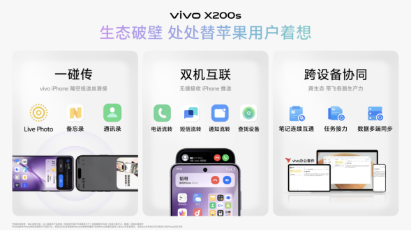 不仅好看,还更好用。vivo200s进一步打破了安卓系统与iOS的生态之墙,为双持用户带来了“双机流转”功能,基于该功能,用户可以通过vivo互传实现两台手机之间的来电通知流转、短信流转、通知流转、设备双向查找,再也不用担心错过重要信息,双持如单持,让用户丢掉双持的“麻烦”,尽享愉悦。同时,vivoX200s还支持与iPhone之间进行照片、视频、文件、日程等信息的隔空传和一碰传,帮助用户突破壁垒,分享愉悦生活。