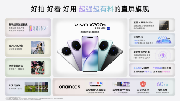 vivo X200 Ultra作为全新高端旗舰机,采用蔡司三大定焦大师镜头和蓝图影像双芯,带来颠覆性的影像创新突破,被誉为“V单”。vivo X200s凭借轻薄直屏设计、旗舰级影像、天玑9400+强悍性能体验,丝滑的OriginOS 5系统以及与iOS生态的无缝且流畅互联,成为全新直屏影像旗舰。