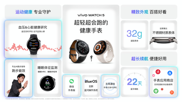 “超轻超会跑”的智能穿戴新品vivo WATCH 5,不仅搭载专业AI跑步指导,还有无感血压风险评估,刷新专业运动监测与健康监测的新高度。凭借其最低仅32g的超轻量级金属机身,至长22天蓝牙续航,为用户带来全场景、高品质的腕上智慧体验。vivo WATCH 5已在vivo官网及各大电商平台开启预售,并将于4月29日正式开售,价格799起。首销期间在各大电商平台购机可享国补优惠,低至679.15元起。
