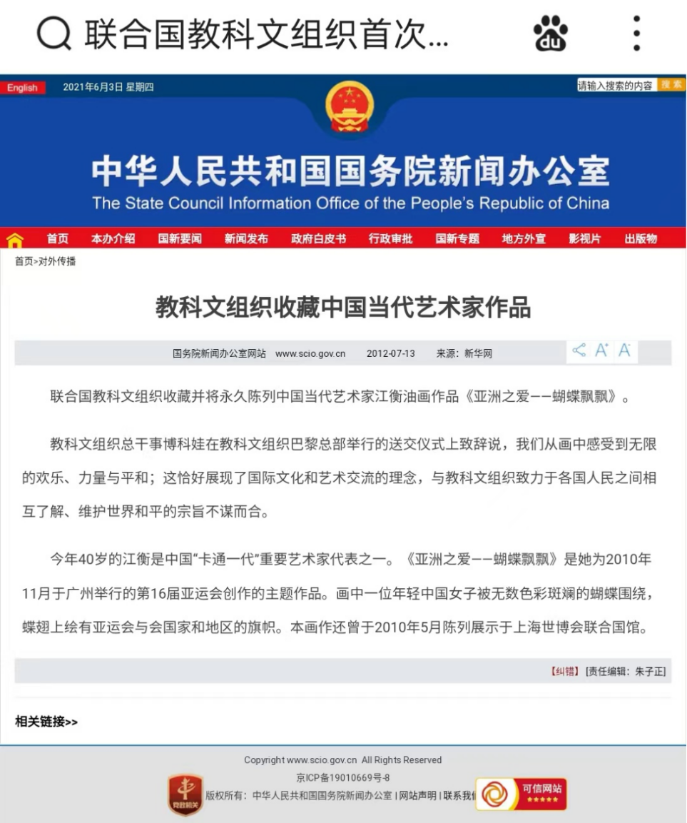 据悉,联合国教科文组织巴黎总部收藏有众多国际艺术大师的艺术品(毕加索、米罗、亨利摩尔、贾克梅蒂等艺术家),而中国被收藏的艺术品,仅有古代的唐三彩、秦始皇兵马俑。此次收藏的画作《亚洲之爱——蝴蝶飘飘》将填补教科文组织在中国当代艺术家作品收藏上的空白。(来源:国际在线报道)