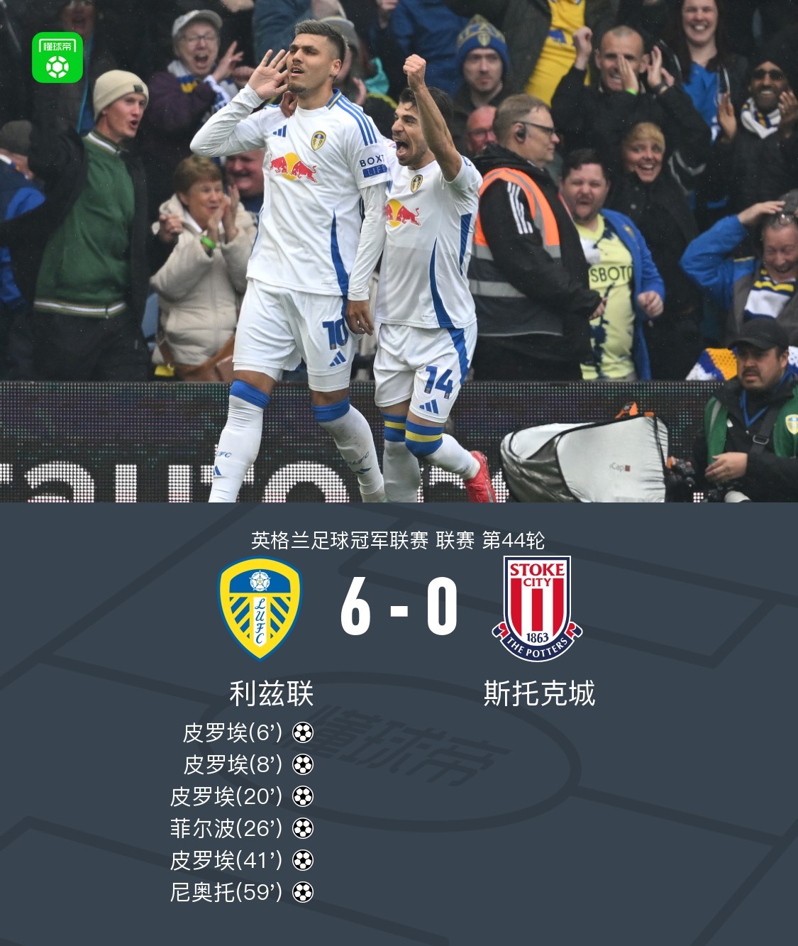 第6分钟,斯托克城后防失误,皮罗埃破门,利兹联1-0领先