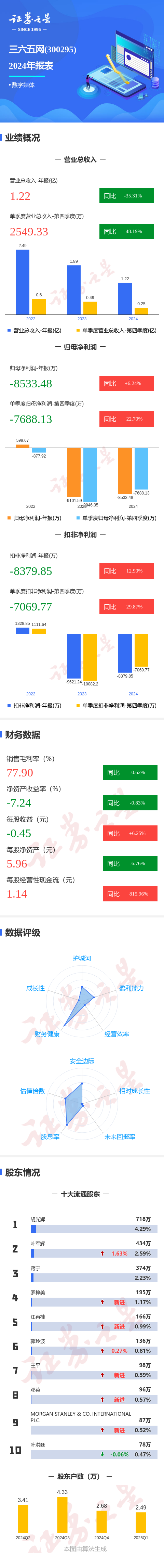 证券之星消息,三六五网2024年年报显示,公司主营收入1.23亿元,同比下降35.31%;归母净利润-8533.49万元,同比上升6.24%;扣非净利润-8379.86万元,同比上升12.9%;其中2024年第四季度,公司单季度主营收入2549.33万元,同比下降48.2%;单季度归母净利润-7688.13万元,同比上升22.7%;单季度扣非净利润-7069.78万元,同比上升29.88%;负债率6.61%,投资收益283.48万元,财务费用-258.2万元,毛利率77.9%。