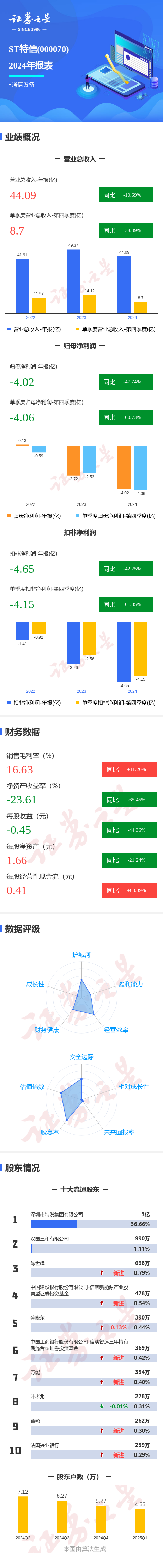 证券之星消息,ST特信2024年年报显示,公司主营收入44.09亿元,同比下降10.69%;归母净利润-4.03亿元,同比下降47.74%;扣非净利润-4.65亿元,同比下降42.26%;其中2024年第四季度,公司单季度主营收入8.7亿元,同比下降38.39%;单季度归母净利润-4.07亿元,同比下降60.73%;单季度扣非净利润-4.16亿元,同比下降61.86%;负债率68.15%,投资收益6577.31万元,财务费用8857.47万元,毛利率16.63%。