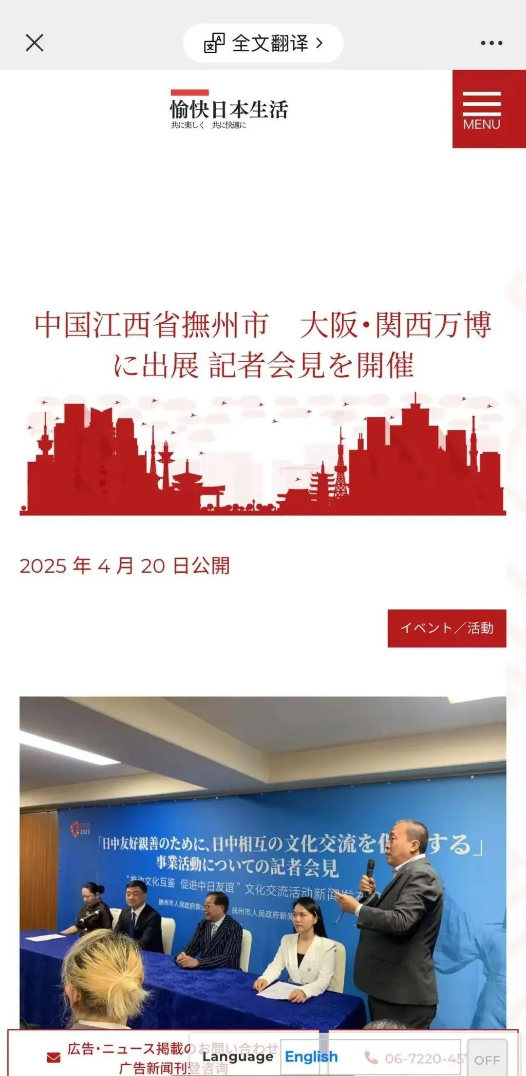 4月20日下午,“推动文化互鉴 促进中日友谊”文化交流系列活动新闻发布会在日本大阪举行,市委宣传部有关负责人详细介绍了此次我市赴日本开展系列文化交流活动有关情况,并回答中外记者提问。