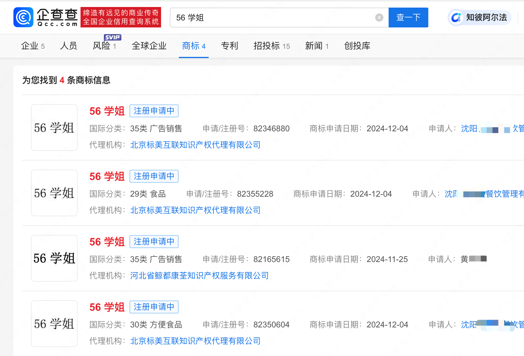 据企查查APP显示,吴柳芳走红后“56 学姐”已被申请注册商标,申请人包含一餐饮公司等,国际分类涉及广告销售、 食品等。