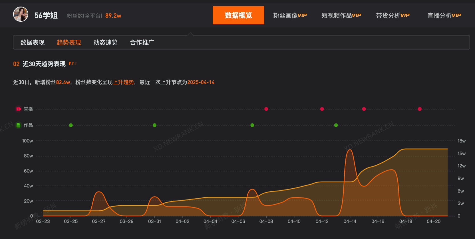 此前,吴柳芳账号“56学姐”被采取禁言、清除因违规行为增长的粉丝等处置措施。清除粉丝700余万,减至4.4万。该账号于3月17日重新发布视频,目前已更新5条内容。据第三方数据显示,其近30日新增粉丝82.4w。