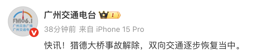 据广州交通电台消息,4月22日9:50,猎德大桥事故解除,双向交通逐步恢复当中。