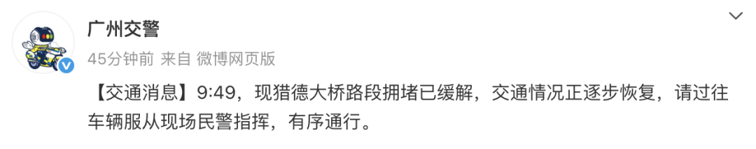 广州交警微博提醒,现猎德大桥路段拥堵已缓解,交通情况正逐步恢复,请过往车辆服从现场民警指挥,有序通行。
