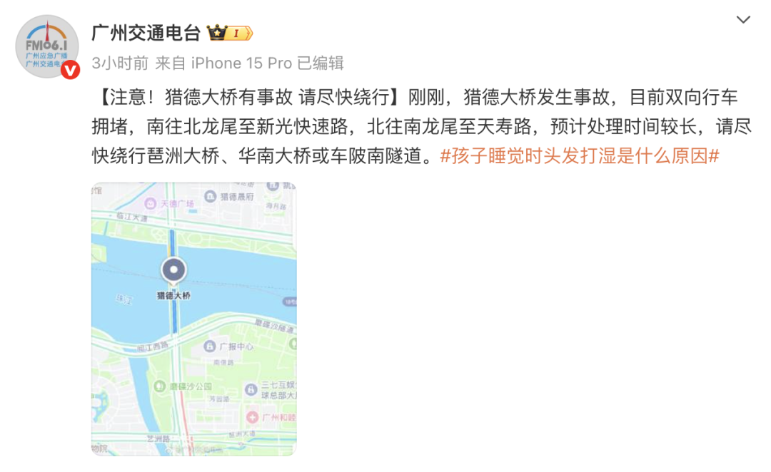 22日早上,广州交通电台发文:“刚刚,猎德大桥发生事故,目前双向行车拥堵,南往北龙尾至新光快速路,北往南龙尾至天寿路,预计处理时间较长,请尽快绕行琶洲大桥、华南大桥或车陂南隧道。”
