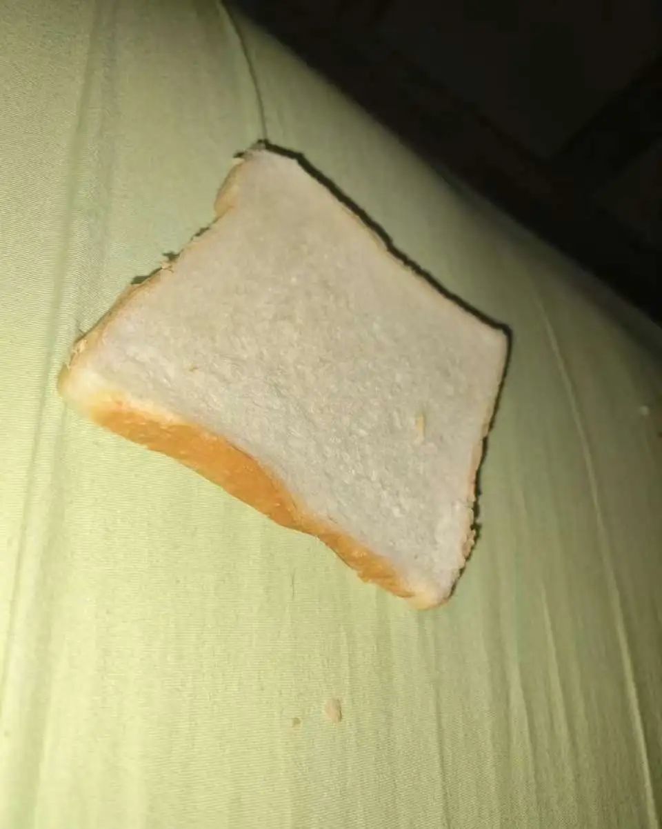 原来是自家小猫正叼着片带口水印的面包,正努力把面包往她床上送!