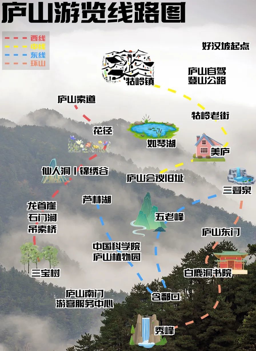 庐山很大,分山上山下、东西中线,滚妹也是去了三次才把那边搞明白。庐山景区包括核心景区(5A)和8大环山景区:三叠泉、白鹿洞书院、秀峰、观音桥、碧龙潭、桃花源、马尾水、莲花洞。