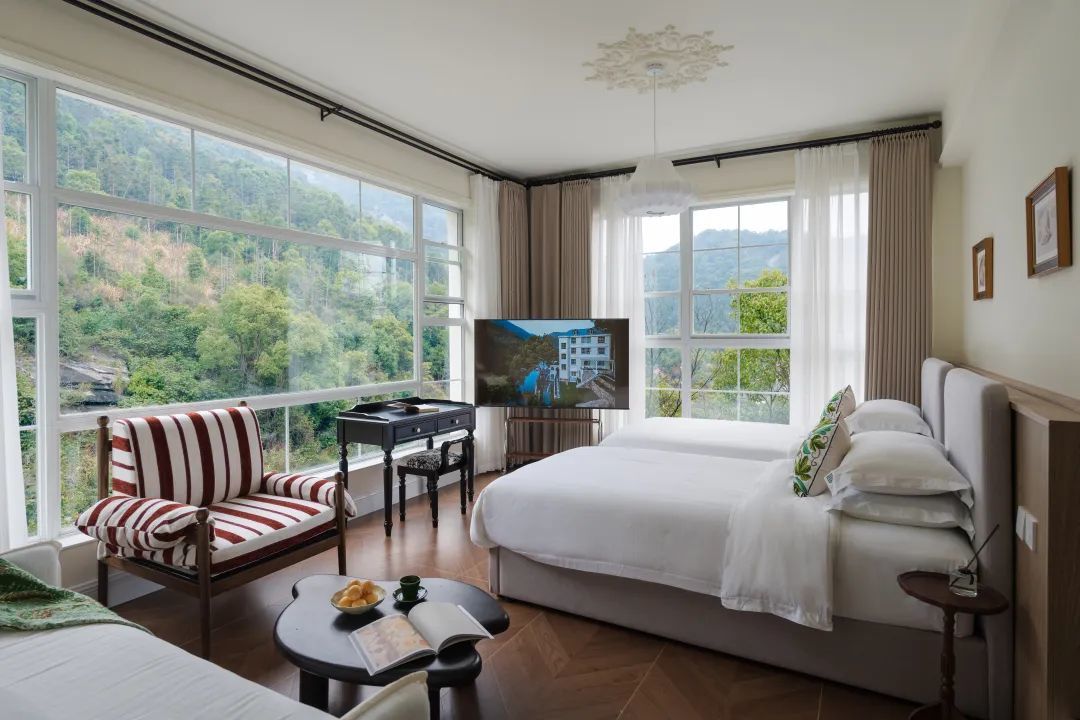 以原木与白墙为基调,落地窗外是绵延的竹林与远山。清晨推开窗,雾气从山谷漫入房间,仿佛住进云里。