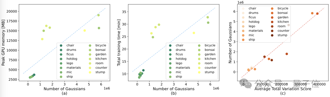 图三:计算成本(GPU显存占用、训练效率)、高斯点数量、数据集图像复杂度之间的强正相关关系。对于不同的数据集场景,(a) GPU显存占用和高斯点数量的关系;(b)训练耗时和高斯点数量的关系;(c) 高斯点数量和图片复杂程度(以Total Variation Score衡量)的关系。