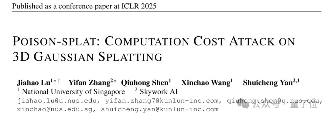 来自新加坡国立大学和昆仑万维的研究者在 ICLR 2025上的Spotlight论文《Poison-Splat: Computation Cost Attack on 3D Gaussian Splatting》中,首次揭示了这一致命漏洞,并提出了首个针对3DGS计算复杂度的攻击算法:Poison-Splat。