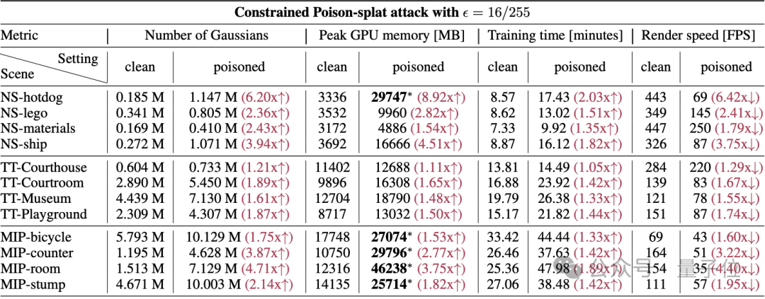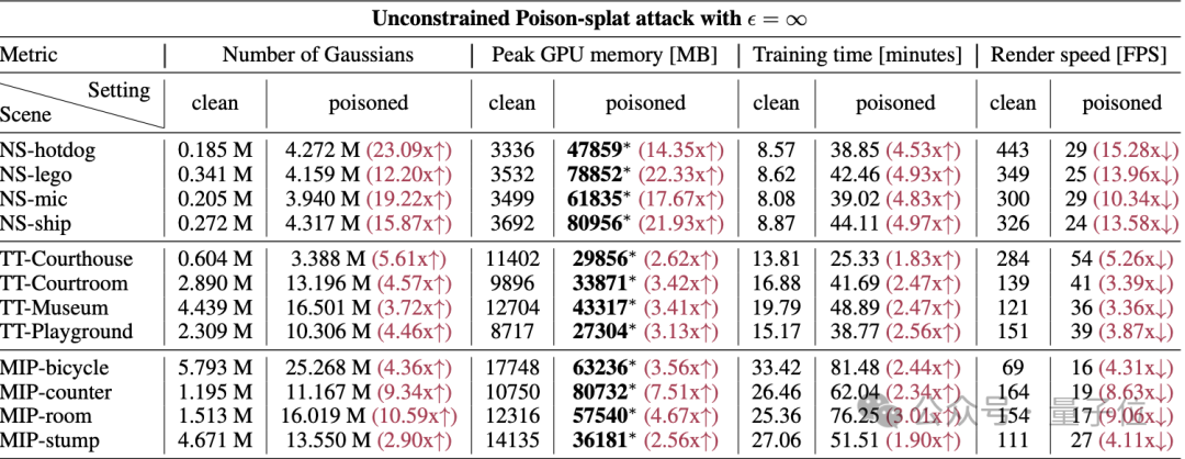研究者在多个公开3D数据集(NeRF-Synthetic、Mip-NeRF360、Tanks and Temples)上评估了攻击效果。实验结果证实,对于危害最大的无限制攻击,其攻击效果令人震惊。在被攻击的最差3D场景下: