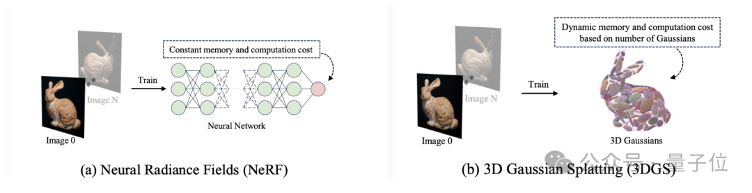图二:NeRF (左) 和 3D Gaussian Splatting (右) 分别引领了3D视觉的一个时代,但它们的核心思想却截然不同。NeRF (图a) 使用神经网络对三维场景隐式建模,其复杂度和计算成本由训练者通过超参数人为指定;而 3DGS (图b) 使用不固定数量的三维高斯对场景显式建模,其复杂度和计算成本会根据需要建模的三维内容进行自适应调整。