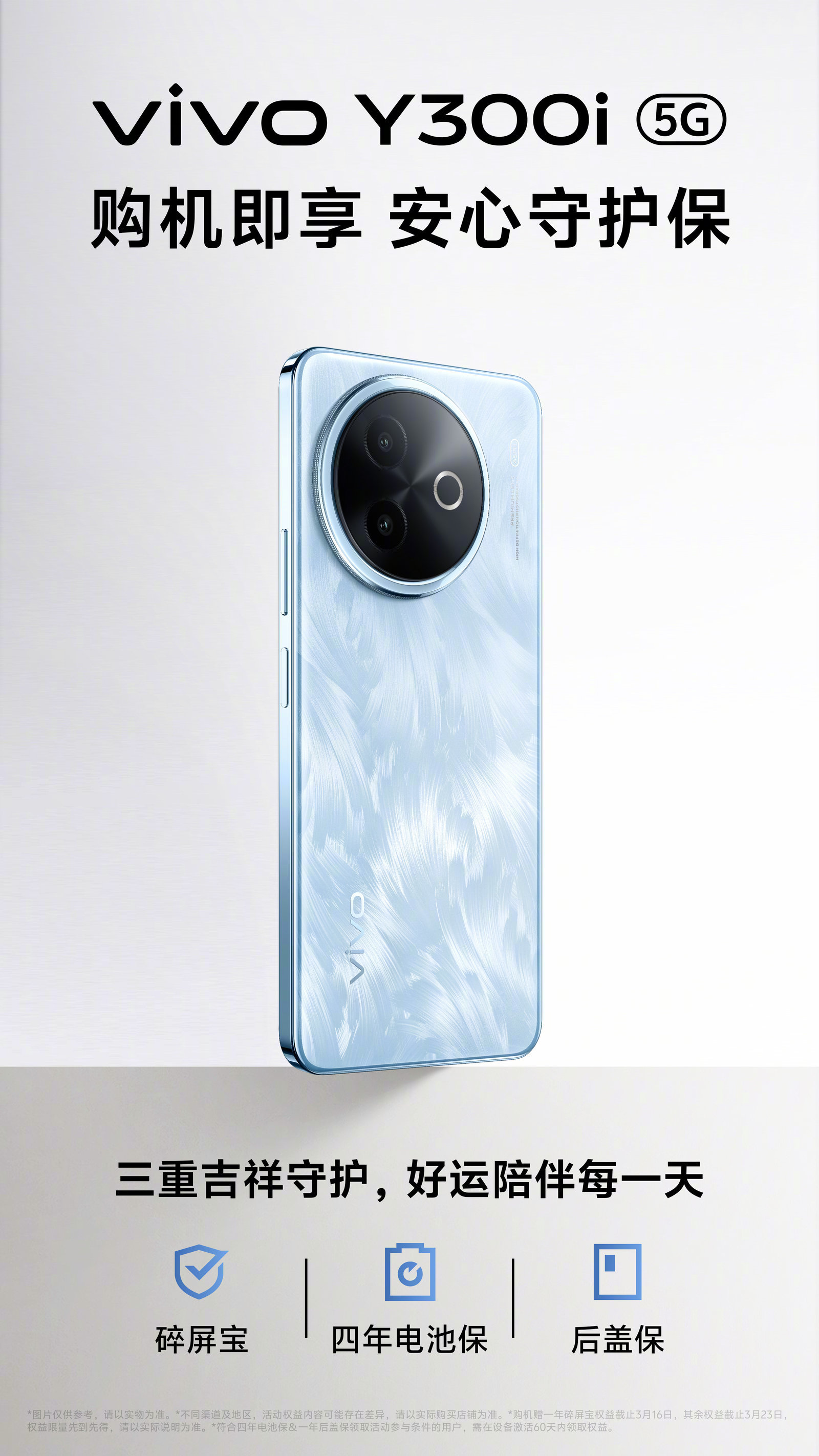 日前,vivo 正式发布 vivo Y300i 手机,主打长续航和超薄坚固机身。首销期间购买即可免费获得价值 363元 限时权益。权益包含碎屏宝、四年电池保、后盖保共三种保障。
