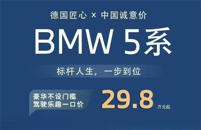 最近有宝马经销商打出了这样一幅关于5系轿车的海报,写着“标杆人生,一步到位”的宣传语。的确,宝马5系曾是很多人的梦想之车,是中大型豪华轿车中的标杆型选手,兼顾舒适与运动,但其价格也是标杆级的,即便是入门款车型,指导价也在40多万元,消费者想要“一步到位”买5系,还是有压力的。但这次宝马经销商说的“一步到位”,可不仅仅是指这款车的标杆级实力,也是说的现在宝马5系的价格,足够优惠,原本可能只有3系的预算,现在就可以一步到位看5系了——这张海报中宝马5系的裸车价,已经降至一口价29.8万元了。
