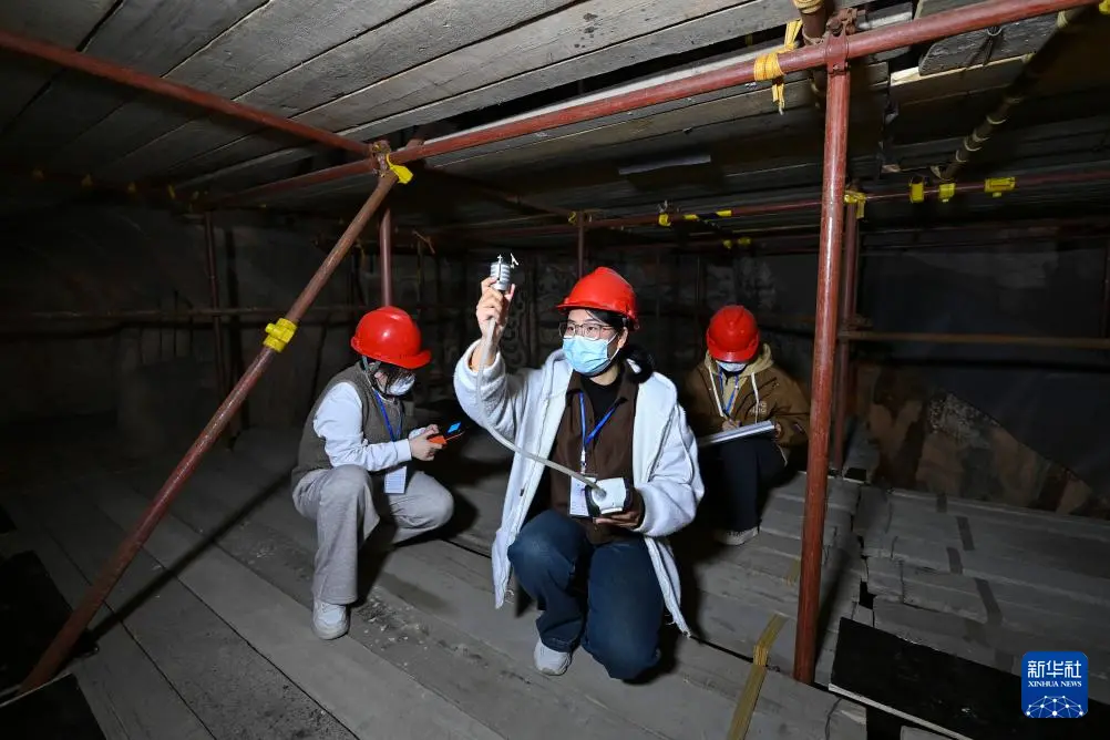 4月15日,来自中国石窟文化联合研究生院的山西大学博士生杨亚娟(中)团队在云冈石窟进行石窟气溶胶单颗粒采样。