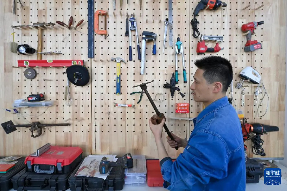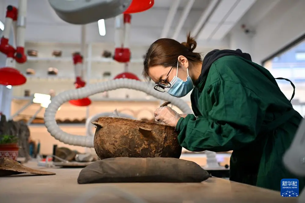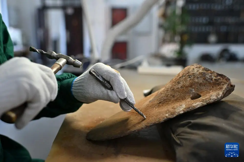 4月15日,在云冈研究院可移动文物修复室,工作人员在进行铁器修复。