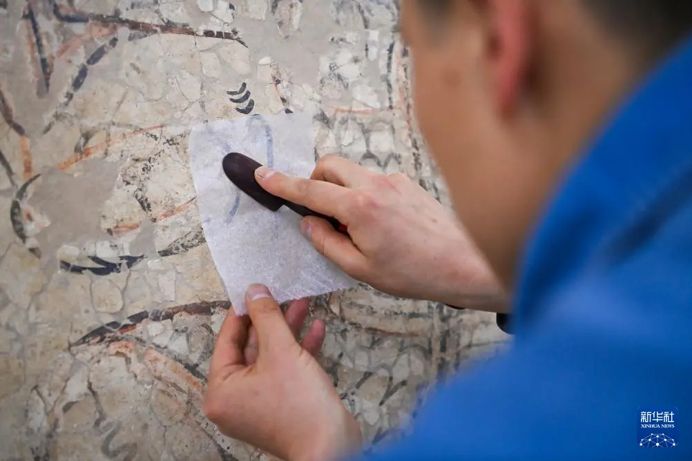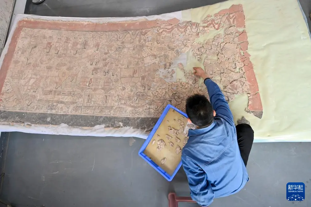 4月15日,在云冈研究院壁画文物修复室,工作人员戴宇翔在修复壁画。