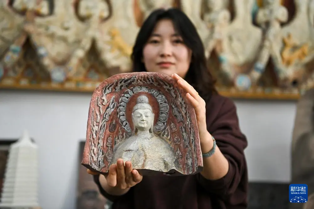 4月16日,在云冈研究院数字化保护中心展厅,工作人员王娜展示一款3D打印佛像模型。