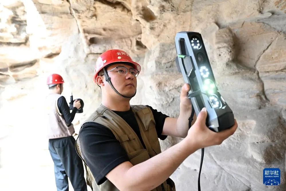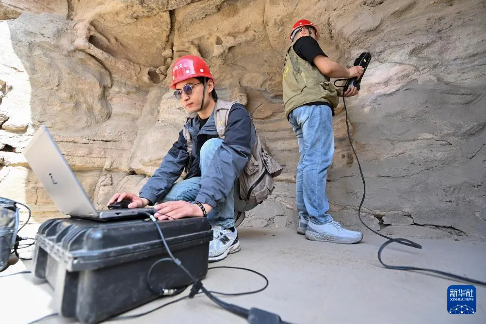 4月16日,云冈研究院数字化保护中心工作人员黄绎帆(左)在云冈石窟进行数字化信息采集。