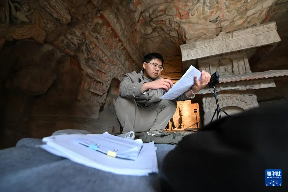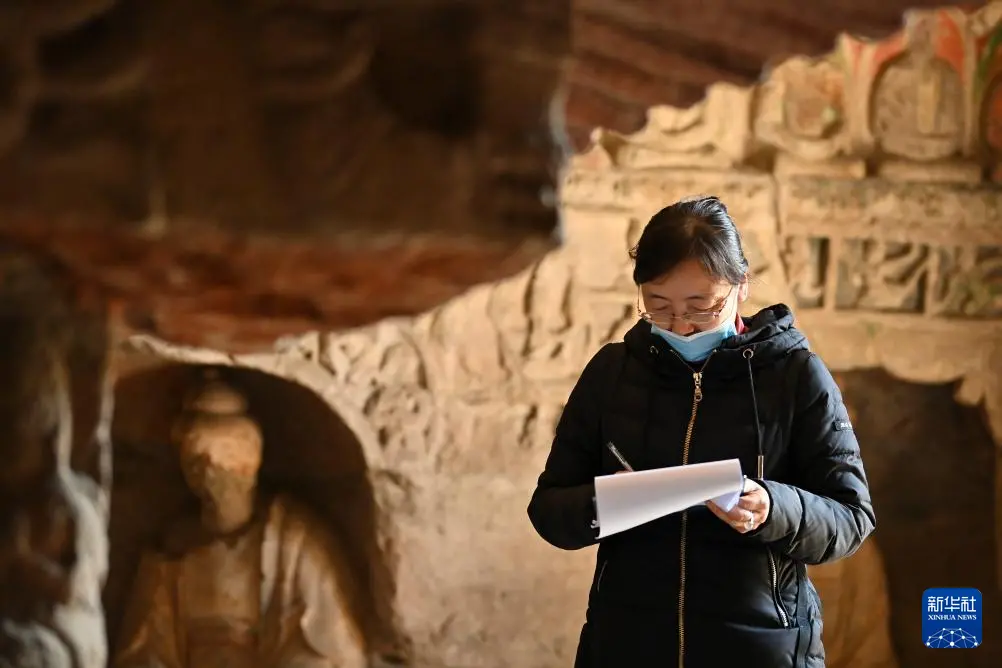 4月15日,云冈研究院历史与民族融合研究中心工作人员王雁卿在云冈石窟进行考古调查。
