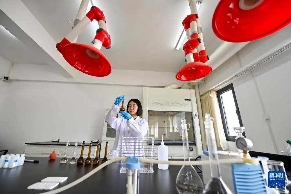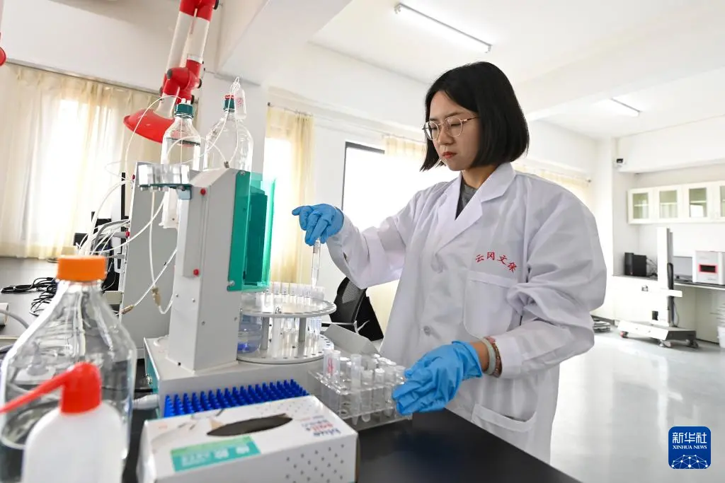 4月16日,在云冈研究院石质文物保护研究室,工作人员张帆在溶解石窟壁面样本。