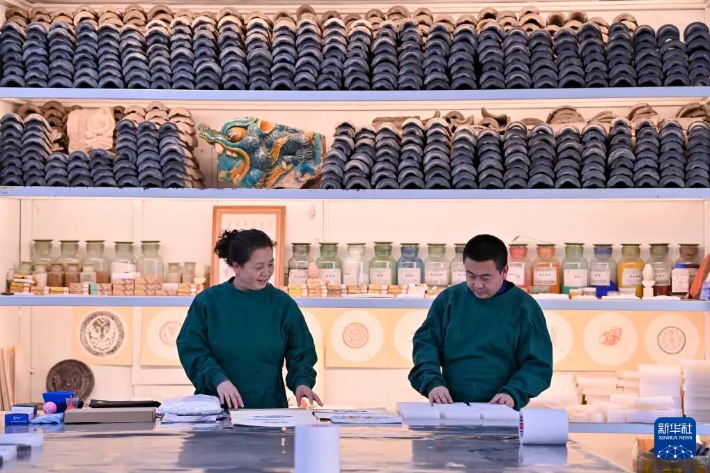 4月15日,在云冈研究院可移动文物修复室,工作人员安永芳(左)和魏松林为接下来的研学活动准备相关用品。