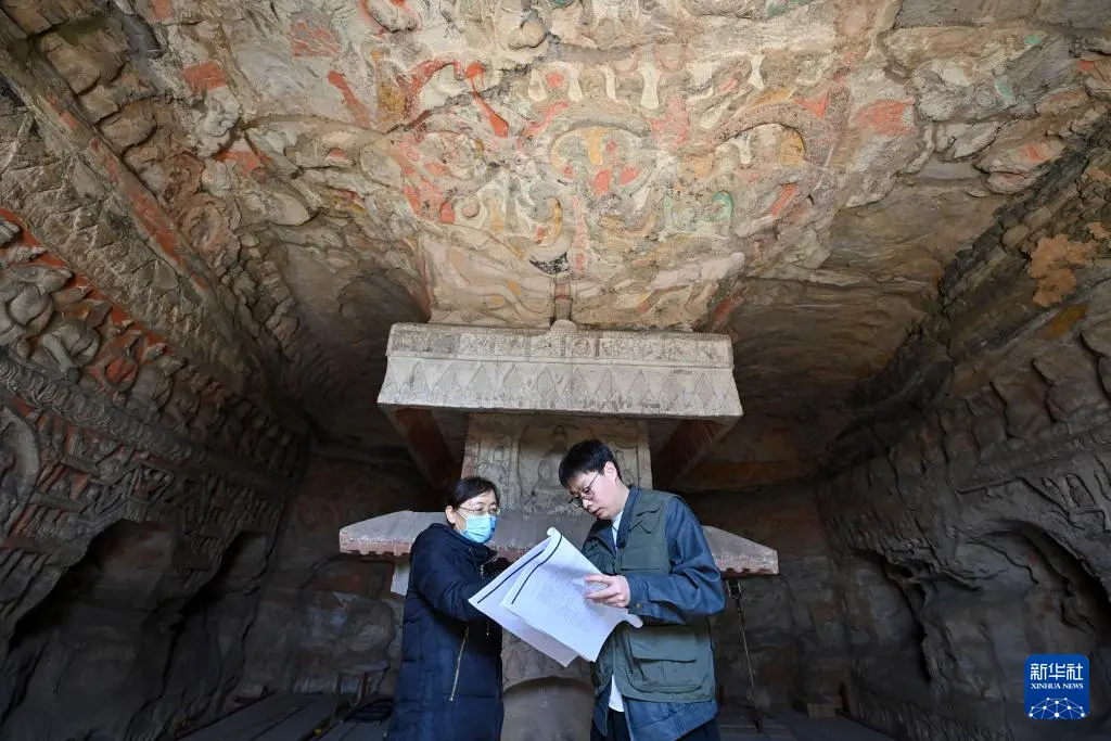 4月15日,云冈研究院历史与民族融合研究中心工作人员王雁卿(左)和马俊宇在云冈石窟进行考古调查。
