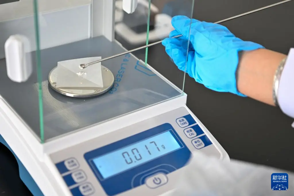 4月16日,在云冈研究院石质文物保护研究室,工作人员张帆为石窟壁面样本称重。