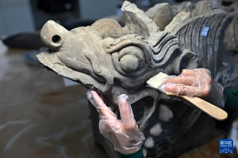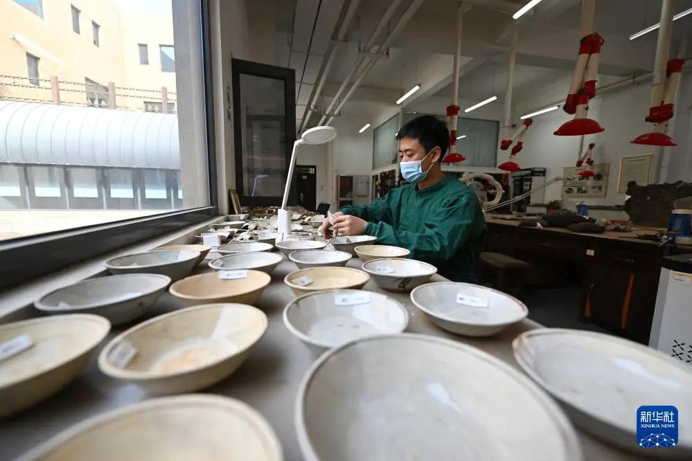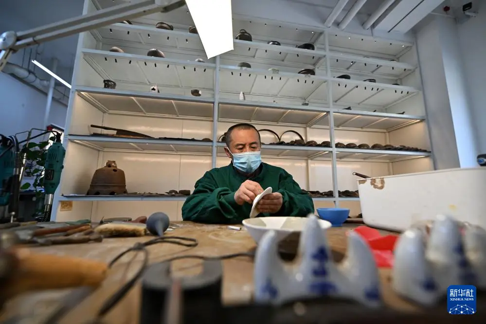 4月15日,在云冈研究院可移动文物修复室,工作人员在进行瓷器修复。