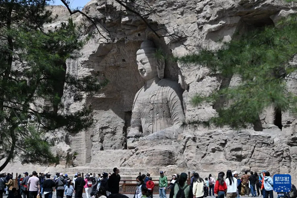 4月16日,游客在云冈石窟游览。