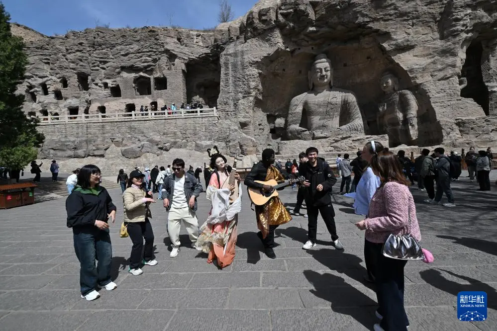 4月15日,在云冈石窟,身着传统服装的演员和游客互动。