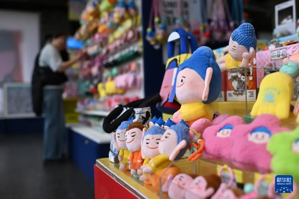 4月16日,游客在山西大同云冈石窟文创空间选购文创产品。
