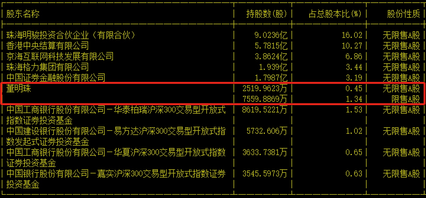 目前董明珠在上市公司格力电器持股约1.01亿股,持股比例为1.79%,对应市值约46亿元。