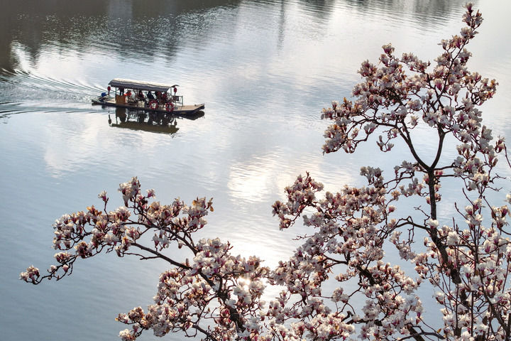 3月6日在安徽省黄山市歙县新安江畔拍摄的玉兰花(无人机照片)。新华社发(施亚磊 摄)